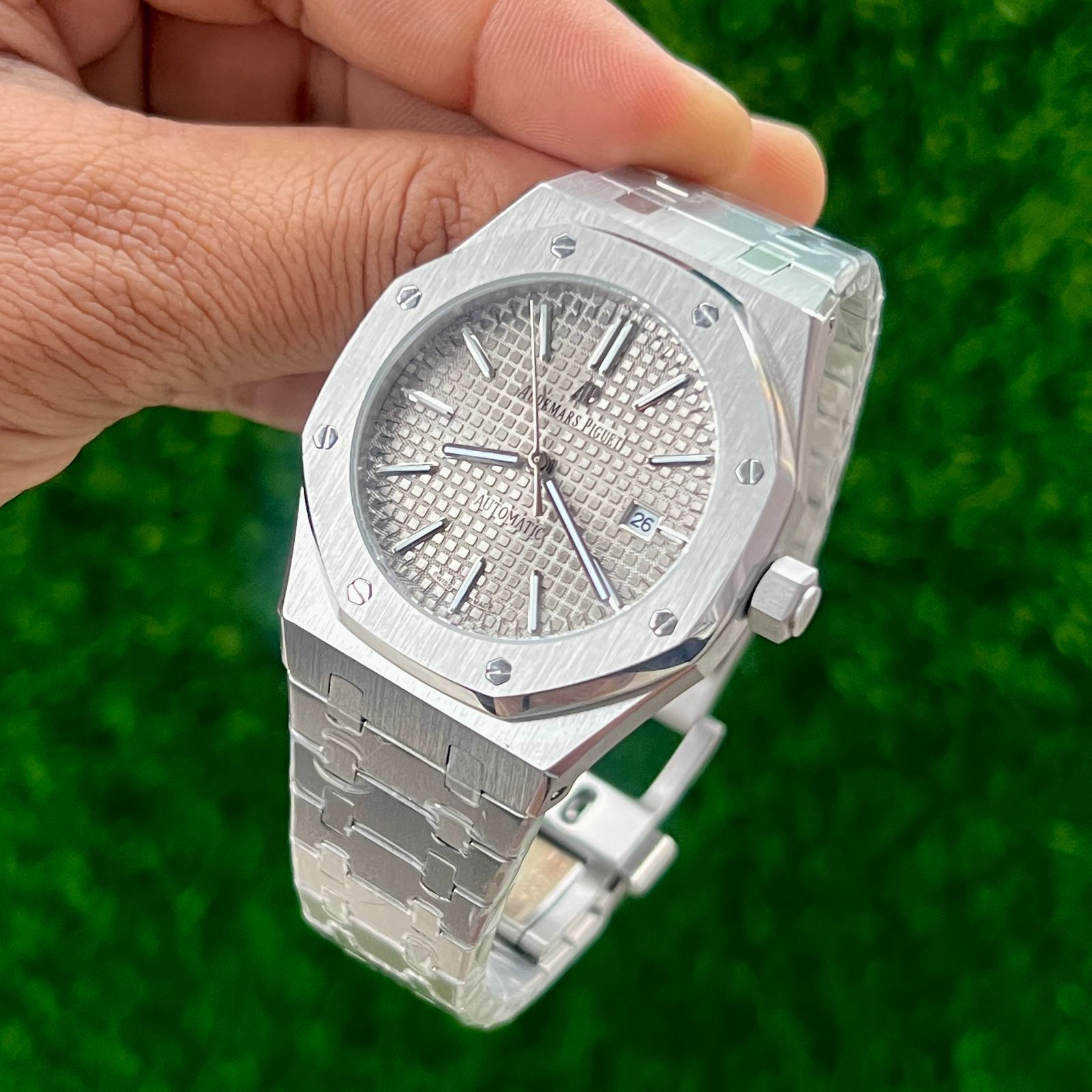 The polished stainless steel bracelet, paired with an AP folding clasp, ensures a secure yet comfortable fit. Its refined finish makes it equally suitable for casual outfits and formal occasions. Delivered in an Audemars Piguet-style brand box.