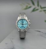 With a 42mm case, it strikes the right balance between presence and wearability. The quartz movement guarantees accuracy, while the anti-reflective sapphire glass protects the dial from scratches and glare. The silver band with a fold-over clasp not only enhances its look but also provides comfort during wear. Plus, all chronograph functions are fully operational, making it a practical choice for daily use.