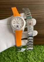 Powered by reliable Semi ETA machinery, it offers precision and durability without the need for a battery. The addition of a date indicator keeps you on track, while the sapphire glass protects the dial from scratches, ensuring clarity in any situation. The watch is fastened with a comfortable stainless steel orange strap bezel and a secure metal oyster chain, making it suitable for both casual wear and formal occasions.