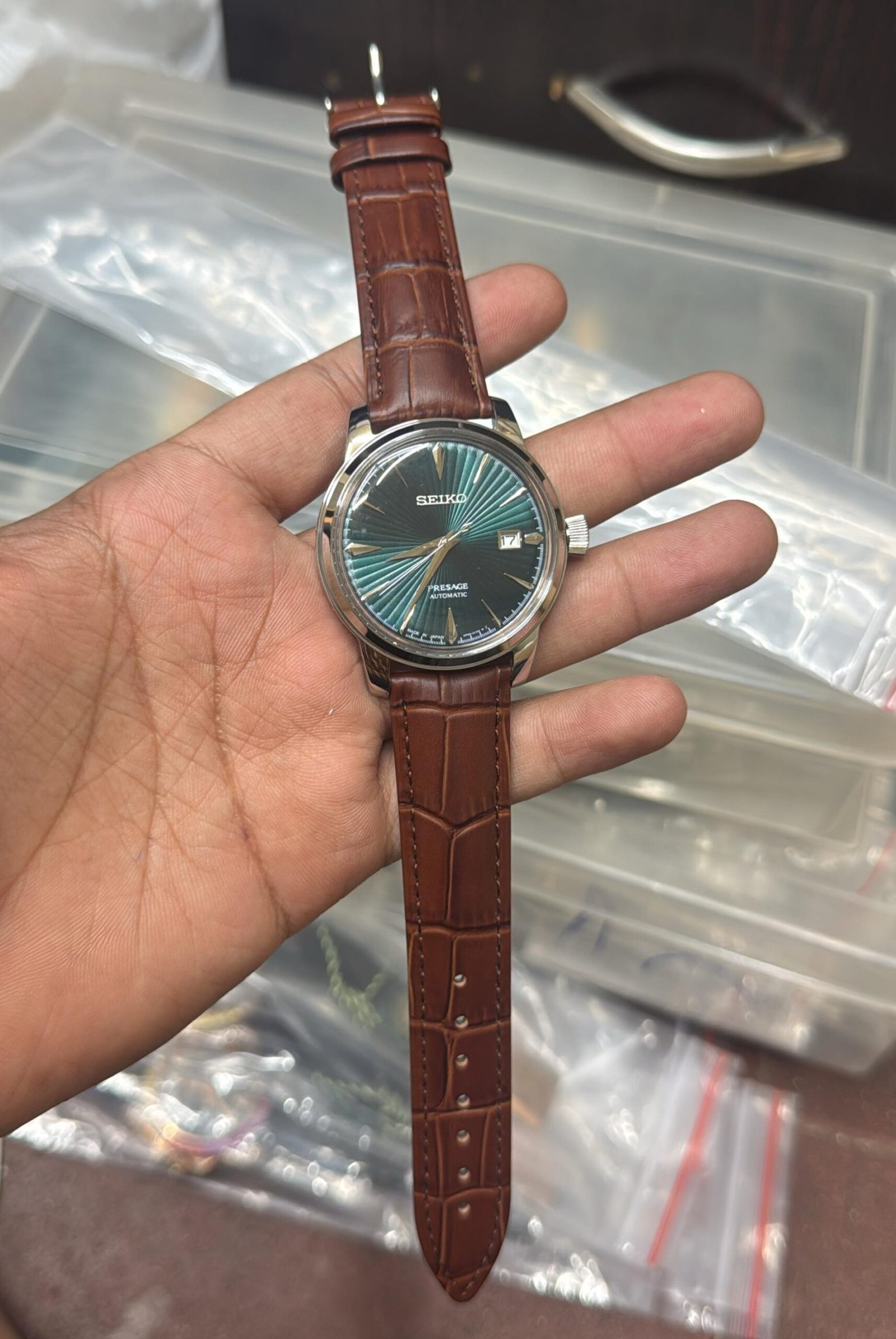 The Seiko Presage Green Dial first copy men’s watch perfectly blends style and functionality, making it an ideal accessory for any occasion. Inspired by the renowned Presage Cocktail series, this watch showcases the timeless beauty of classic watch design with a modern twist.